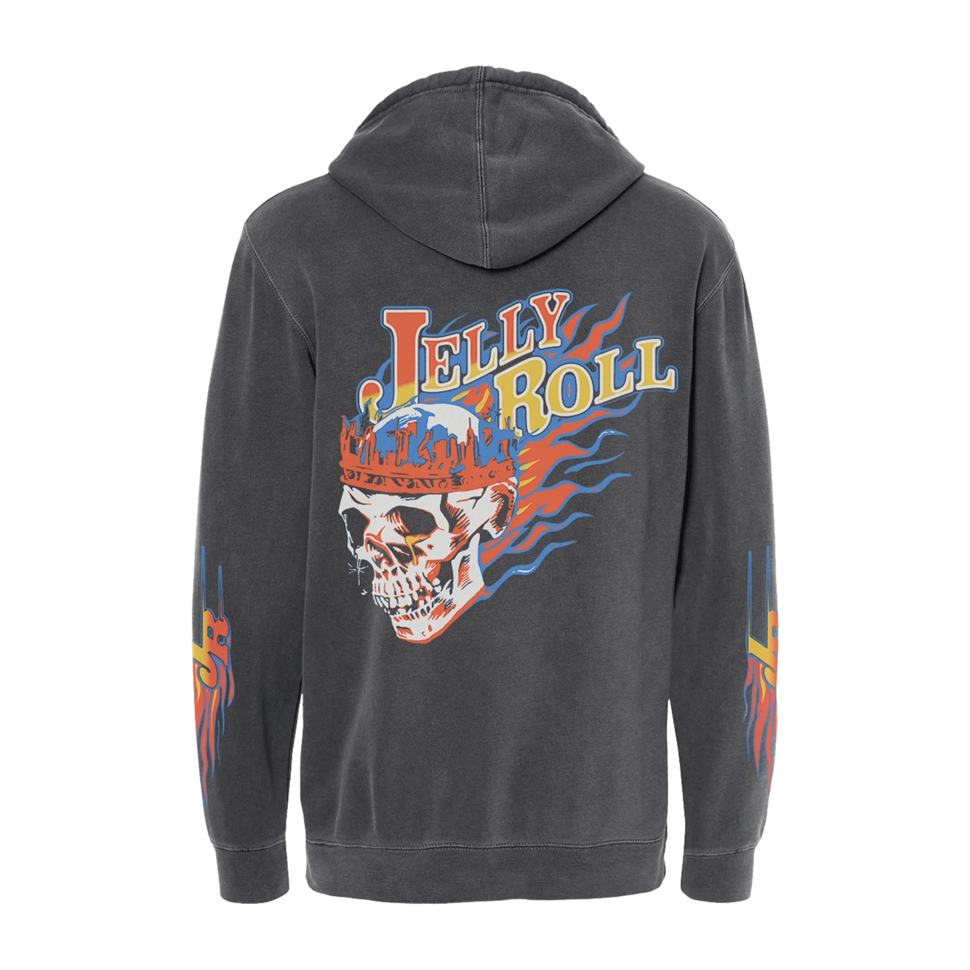Pigment black dyed pullover hoodie with Jelly Roll flame text logo on the front and skull king design on the back. Both sleeves printed with JR flame initials.